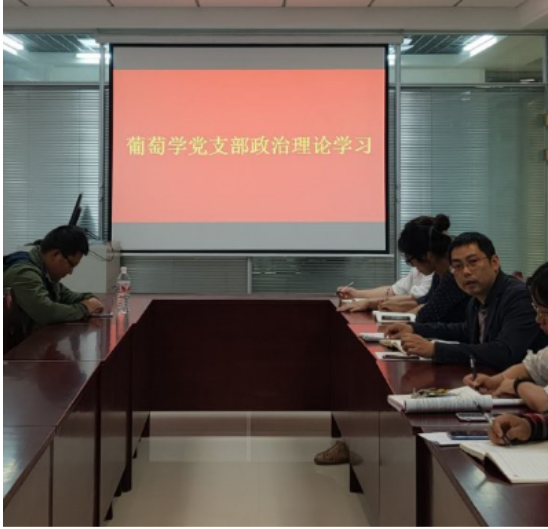 2019年5月29日下午18:00,葡萄酒学院葡萄学党支部全体大会在学院5楼中厅会议室召开,会议主题是葡萄学党支部政治理论学习,刘旭老师主持了会议。