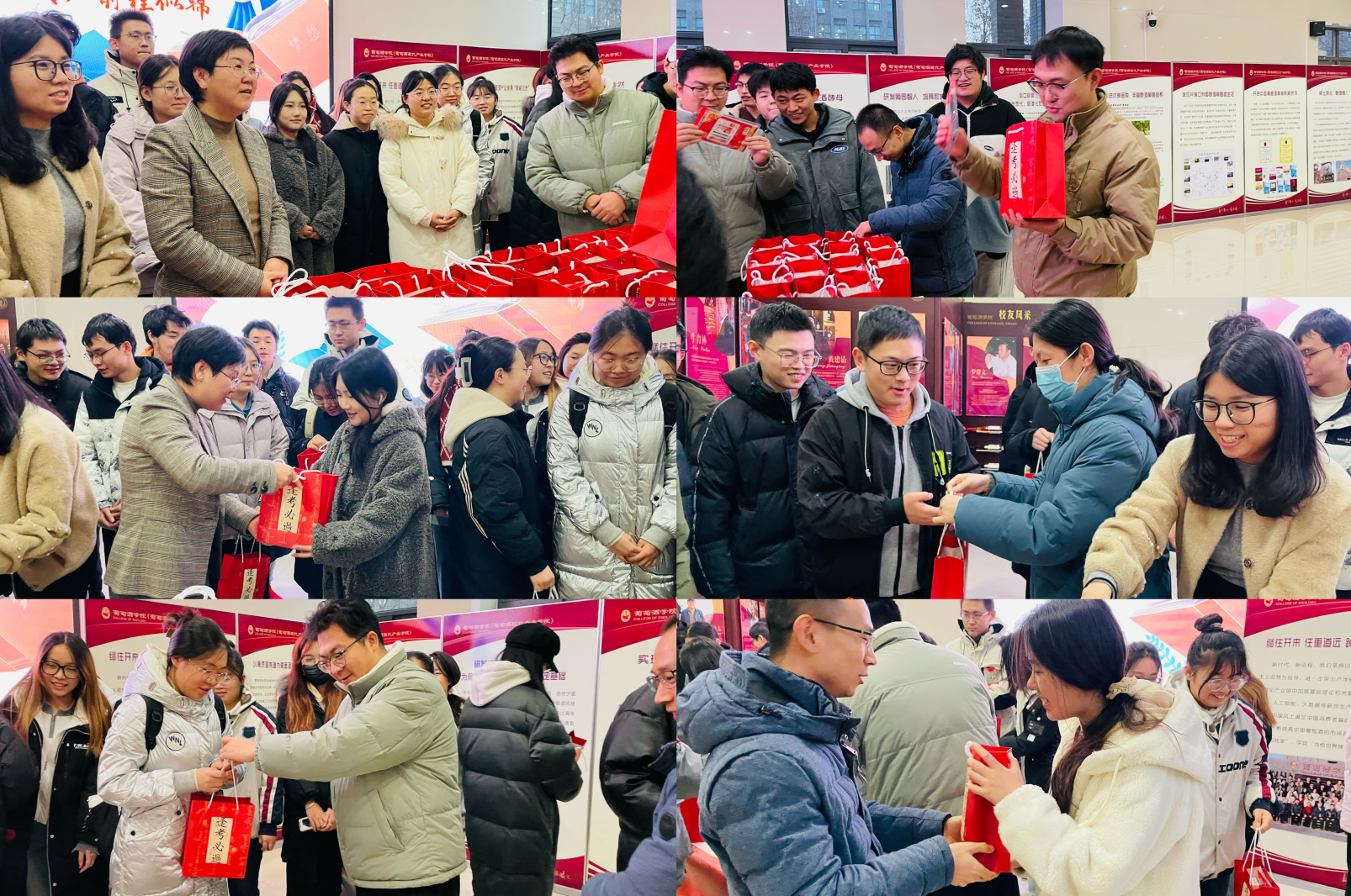 随后,老师们向大家分发了学院精心准备的慰问礼包,包括寓意平安喜乐、心想事成的苹果;象征乘风破浪、心想事成的橙子以及带有专属祝福的咖啡卷和牛奶、文具等,满载着学院对考研学子的期望和祝福。