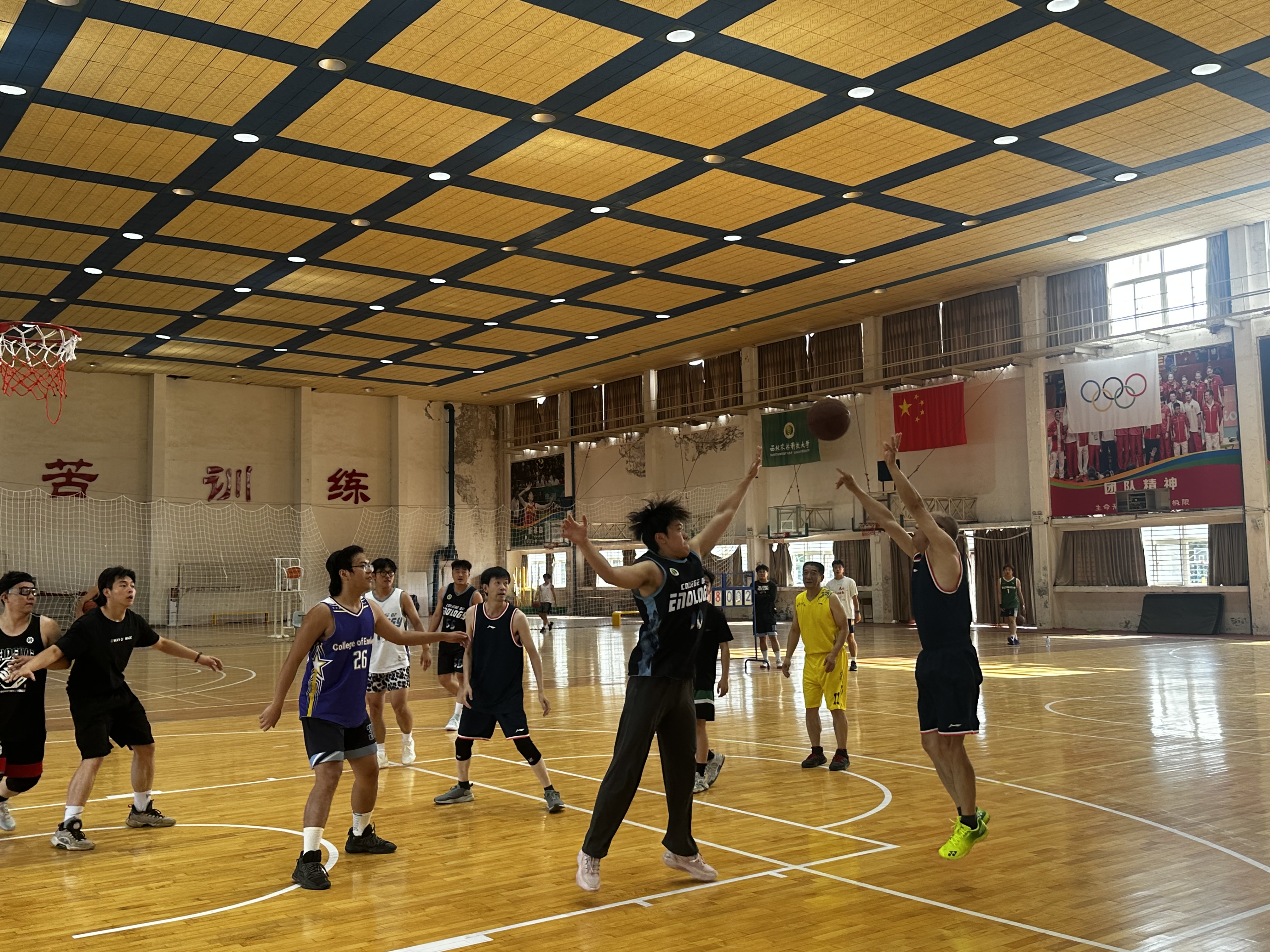比赛开始,教职工队率先发力,刘树文教授一记三分,如同点亮了一盏明灯,照亮了整个赛场。毕业生队迅速反击,前锋饶博涵灵活突破,三步上篮得分,赢得阵阵掌声。在比赛过程中,师生们的每一次传球、每一次防守,都充满了默契与信任。运球声、球鞋摩擦声,仿佛是在诉说着师生们一起度过的美好时光,观众们的欢呼声,则是对这份情谊的最好见证。