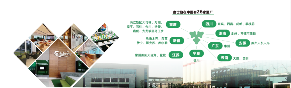 依托重啤股份,嘉士伯中国运营着拥有26家酒厂的供应链网络,核心市场包括重庆、四川、湖南、新疆、宁夏、云南、广东和华东各省,并覆盖全国各地,实现了以六大业务单元为基础的全国布局,即重庆业务单元(含四川、湖南)、新疆业务单元、宁夏业务单元、云南业务单元、国际品牌业务单元和华中业务单元。