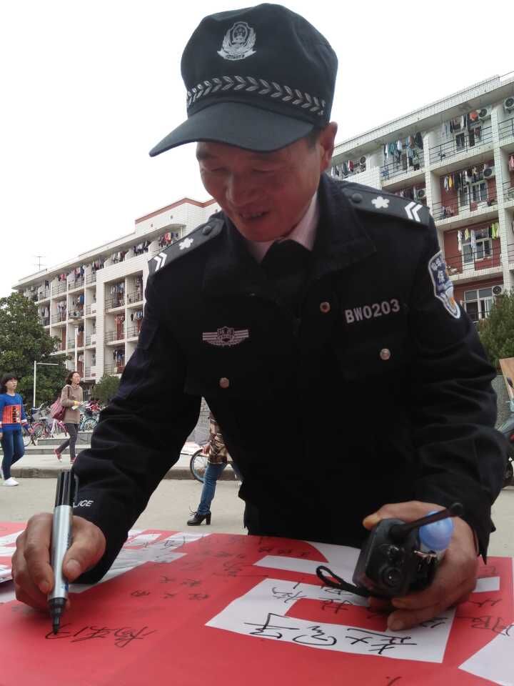 活动现场,两条写有“校友国土护”“学生安保航”的横幅鲜艳的横幅悬挂在宣传栏间,画板上张贴着制作精美的海报,葡萄酒学院院旗也随着春风阵阵飘扬。同学们热情地向大家宣传保卫处老师们的工作和生活,耐心地跟他们讲解马拉松比赛期间的安全常识的注意事项,受到大家积极热烈情绪的感染,路过的同学们也纷纷加入到我们的活动中,纷纷在横幅上签下自己的姓名。保卫处老师的现场参与和互动将活动推向高潮。