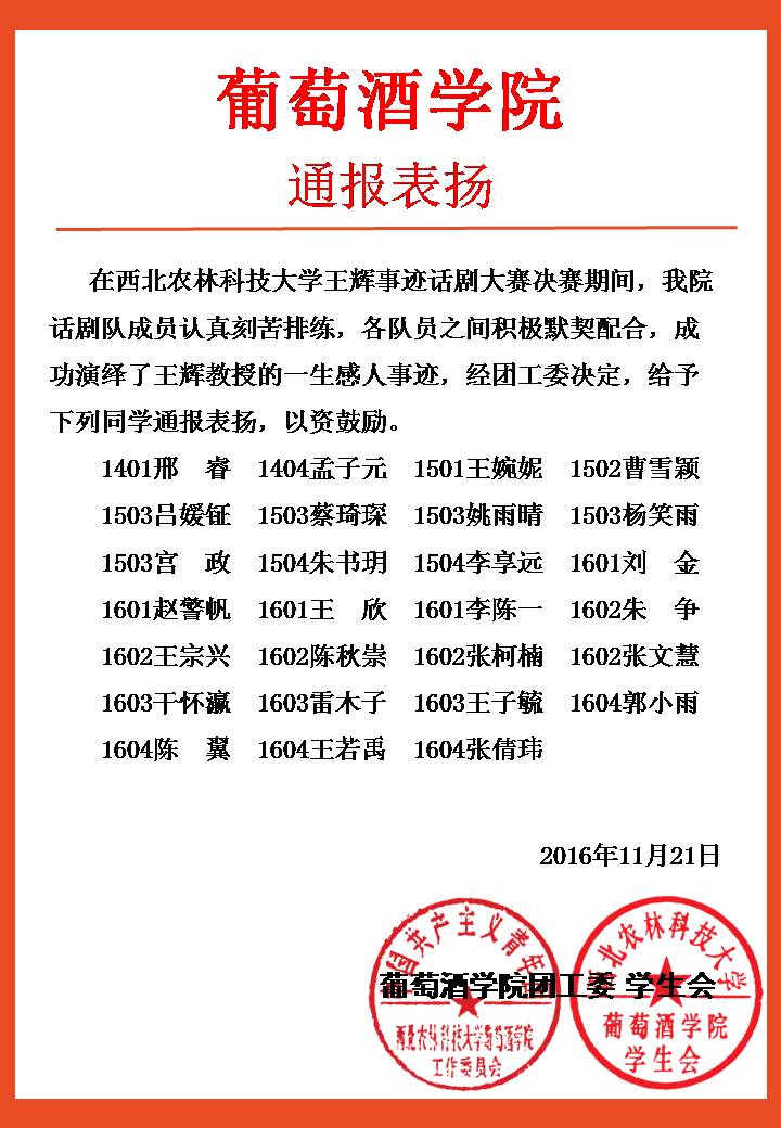 葡萄酒团(2016)41号通报表扬