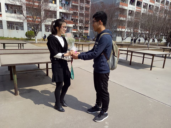 男生志愿者给女同学送花
