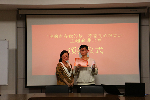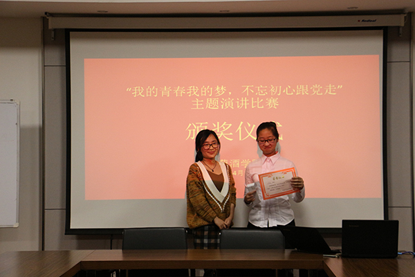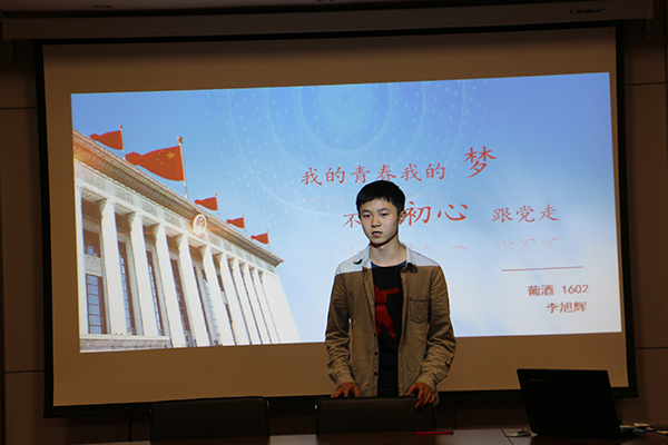 最终,经过激烈的比拼,根据评委老师的打分,荆思雨同学获得第一名,王志磊同学获得第二名,兰慧晶同学获得第三名。由16级辅导员李雅男老师为获得二、三等奖的同学颁奖,葡萄酒学院团工委书记赵星宇老师为获得一等奖的同学颁奖。最后,赵星宇老师总结到:同学们要跟随党的步伐,牢记党的精神,不忘初心,实现梦想。