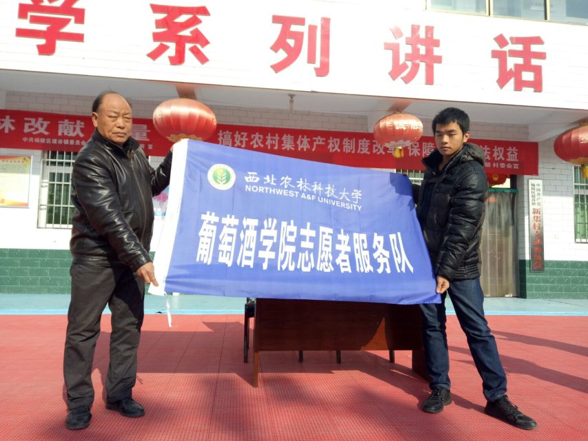 签约仪式后,赵老师为新集村授牌,村委会主任卢建平也为西农葡酒志愿小分队进行授旗,这一刻标志着葡萄酒学院社践部所开展的志愿者工作得到了初步的成果,具有里程碑式的意义。