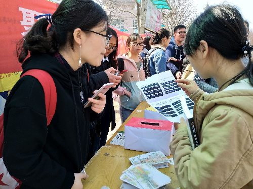 活动过程中,青习社成员们准备了有关“两会”内容的小纸条、调查问卷以及外观精美的彩纸、明信片等等,让大家进行有奖答题,鼓励更多人参与活动,各个环节设计得新颖有趣。最后,所有礼品在工作人员的积极宣传和同学们的热情参与下全部送出,同时,同学们也畅所欲言,纷纷表达对两会的感想,其中一名参与者说: