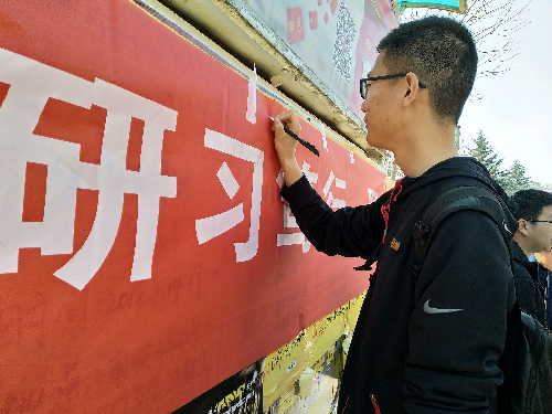同学们在横幅上签名