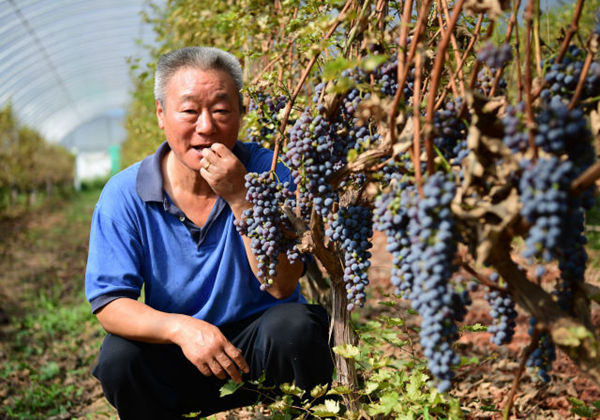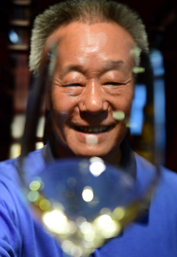李华与他酿制的干白葡萄酒(9月7日摄)
