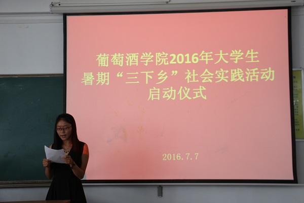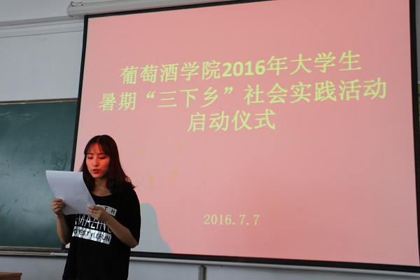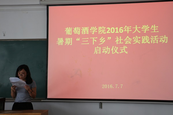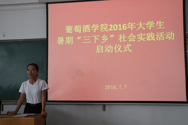 7月7日下午,葡萄酒学院2016年大学生暑期“三下乡”社会实践活动启动仪式在八号楼109教室举行。院党委副书记邓亚丽、团工委书记赵星宇、辅导员李雅男出席,参加暑期“三下乡”社会实践活动的近百名队员参加启动仪式。仪式由院团工委书记赵星宇主持。