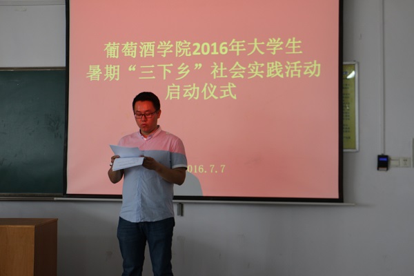 启动仪式上,赵星宇老师介绍了学院暑期“三下乡”社会实践活动的组队情况。本次活动以我院学生为主体、各院学生为补充,学生自发组建了包括葡萄酒产区调研、传统文化实践等十一支团队,其中10支团队获校团委资助立项。在这10支团队中,由我院2014级陆佳玲同学负责、陶永胜教授指导的“贺兰山东麓葡萄酒产业的‘小酒庄,大产区’发展模式调研团队”脱颖而出,在获评校级重点项目立项的基础上,代表我校唯一入选“2016年陕西高校大学生暑期‘一带一路’社会实践项目”,把我院暑期社会实践活动推向了新高度。