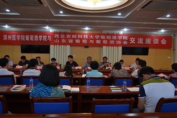 当日下午考察团一行来到滨州医学院,与滨州医学院代表、山东省葡萄与葡萄酒协会代表举行了亲切的交流座谈,座谈会由胡文效会长主持。滨州医学院葡萄酒学院刘世松副院长向与会代表介绍了滨州医学院葡萄酒学院的建立、发展。滨州医学院葡萄酒学院成立于2014年6月,葡萄酒学院现有专制教师22人,已连续两届招生,相关仪器设备投入3000余万元,是我国东部第一所专门培养葡萄与葡萄酒高端专业人才的特色学院。