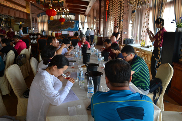 台依湖酒庄首席酿酒师兼总经理热拉尔·高林(Gerard Colin)以及酿酒师华玉波(我院校友)等陪同考察团参观了台依湖已经正式营业的零零柒酒庄,酿造车间、灌装线以及葡萄园。高林是一个名副其实的中国通,在中国的新疆、蓬莱产区都工作过,也是葡萄酒学院的老朋友。考察团在台依湖天鹅堡酒吧进行了葡萄酒品鉴,共品鉴了干白、干红、桃红、甜红、甜白12款葡萄酒。台依湖葡萄酒的质量得到了考察团的肯定,王华院长在品鉴结束后给台依湖酒庄提了两点建议:1) 尽量降低某些甜型葡萄酒的甜度,做半干、半甜葡萄酒;2)白葡萄酒尽量不进橡木桶,最优化保持浆果的自然香气。