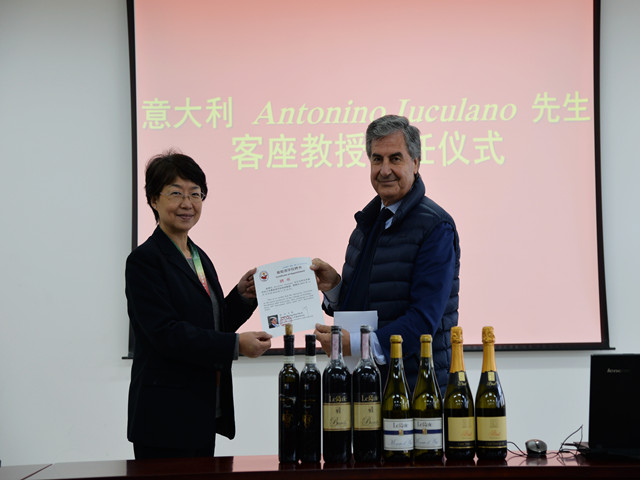 2016年11月10日,葡萄酒学院聘请意大利Antonio Iuculano先生为葡萄酒学院客座教授。王华院长为Antonino先生颁发聘书,并赠予西北农林科技大学纪念品。