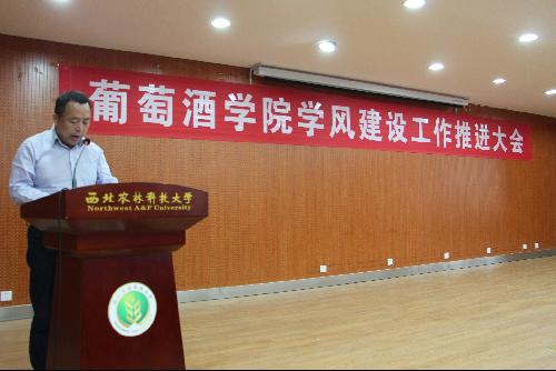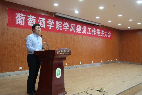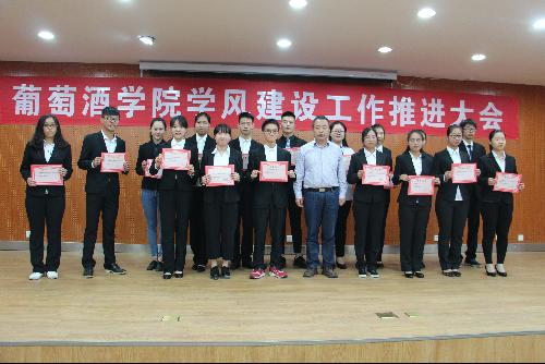 邓亚丽副书记安排部署葡萄酒学院加强学风建设工作,宣读《葡萄酒学院关于进一步加强学风建设工作的实施办法》,分别从学院层面、教师层面和学生层面围绕教风和学风提出了多项措施,并从加强师德师风建设、完善质量监控、强化激励约束机制三个方面提出具体要求。陶永胜教授代表教师发言,陶教授从自身授课经历出发,进行反思和总结,对学院教师教学风貌提出希望和要求。陶老师指出教师要谨记职责和任务,严谨教风,教书育人,为行业培养真正的人才,为社会教育出合格的接班人。1601班荆思雨代表学院全体学生做出承诺,要严格遵守学习纪律,践行优良学风,展现葡酒学子良好的学习风貌。刘树文副院长宣读“葡萄酒学院优良学风示范生”的表彰决定,学院对“学风建设年”期间涌现出的白晓璇等17名同学予以表彰,希望他们能够发挥先锋模范作用,在同学中间形成“帮、比、赶、超”的良好学习氛围。